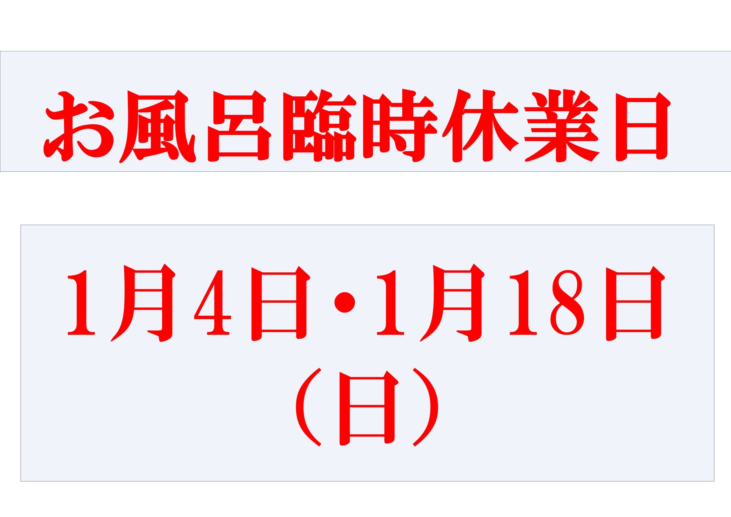2026年1/4(日)・1/18(日)はメンテナンスのため全日お風呂は臨時休業いたします。お間違えのないようお気をつけください。