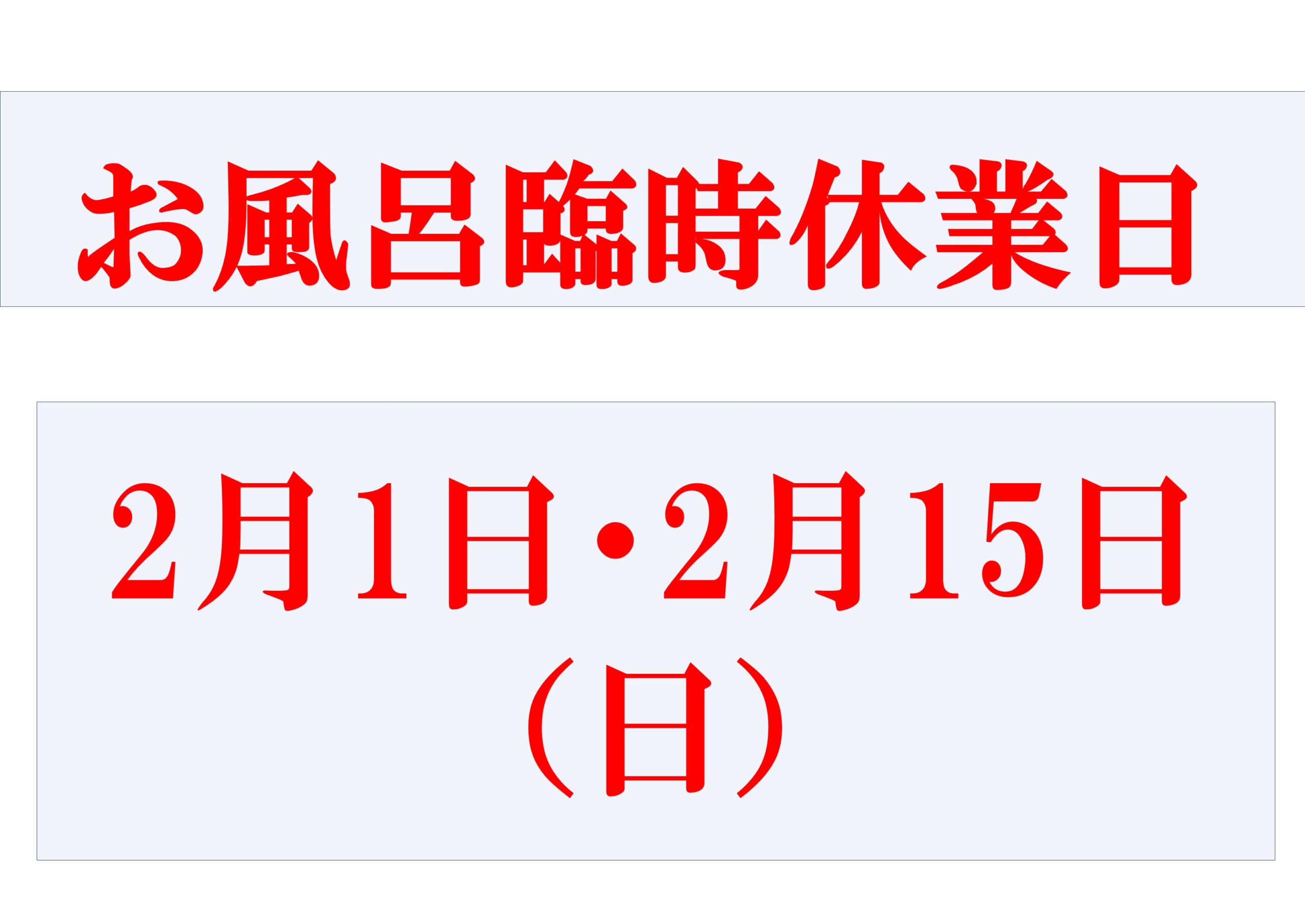 2026年2/1(日)・2/15(日)はメンテナンスのため全日お風呂は臨時休業いたします。お間違えのないようお気をつけください。