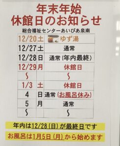 〔ゆず湯〕と〔年末年始休館日〕のお知らせ