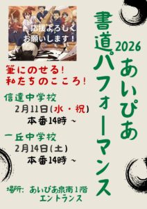 2026あいぴあ書道パフォーマンスを開催します。2026年2月11日(水・祝)信達中学校 2月14日(土)一丘中学校、どちらも14時から本番です。中学生の皆さまが何日も練習を重ね頑張ってきた姿にぜひあたたかい応援・ご声援をお願いいたします。